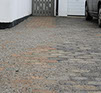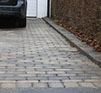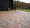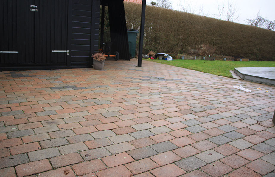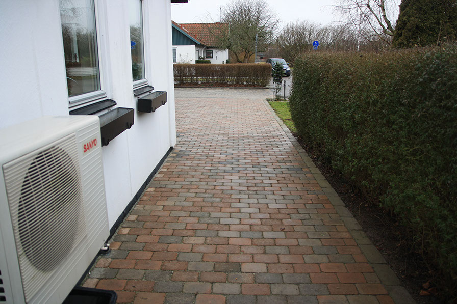 Här var väldigt mycket sättningar där det samlades vatten och byastenen var gammal och sliten, när man har stora sättningar tyder det på att underarbetet är undermåligt och ska egentligen göras om helt. Här skulle dock allt göras om inom några år igen och kunden önskade en billigare tillfällig uppfräschning. Så här har den gamla byastenen tagits upp, underlaget har jämnats till med fall från huset, och byastenen har slutligen återanvänts uppochnervänd. Även en nersänkt mur längs häcken har lagts för att stabilisera utkanten av plattytan.
